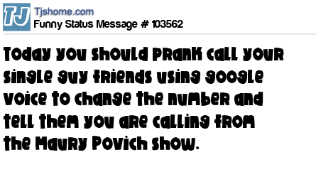 X Today you should prank call your single guy friends using google voice to change the number and tell them you are calling from the Maury Povich show.