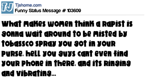 X says What makes women think a rapist is gonna wait around to be misted by tobassco spray you got in your purse, hell you guys cant even find your phone in there, and its ringing and vibrating...