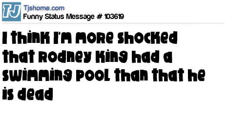 - # 103590 Rodney King was found dead in a swimming pool. Goes to show you kids.....It's hard to snort coke when your underwater.
