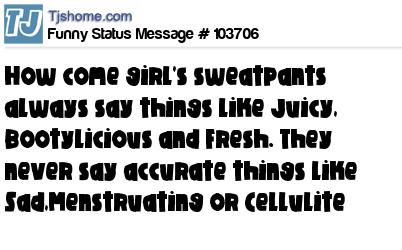 X  How come girl's sweatpants always say things like Juicy, Bootylicious and Fresh. They never say accurate things like Sad,Menstruating or Cellulite