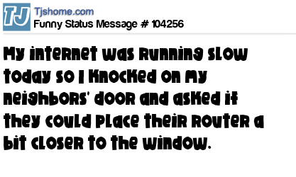 - # 97130 One of my friends just called me and said his internet was not working...I told him to reset his router and he said "I can't, it's in my neighbors house" LOL