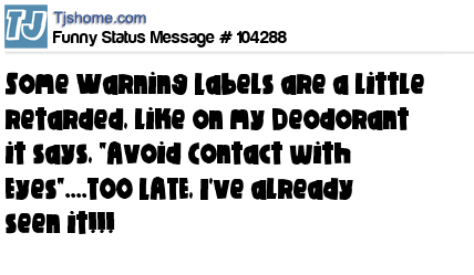 X is Some Warning Labels are a little retarded, like on my Deodorant it says, "Avoid Contact with Eyes"....TOO LATE, I've already seen it!!!