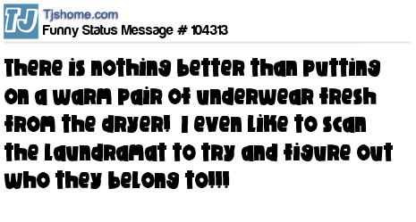 - # 122664 I LOVE putting on underwear fresh out of the dryer. They're so warm and cozy! I HATE when the lady in the laundromat tries to take them back! :(