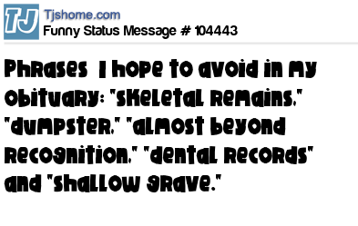 - # 155745 Phrases I hope to avoid in my obituary: "skeletal remains," "dumpster," "almost beyond recognition," "dental records," "blood bath" and "shallow grave."