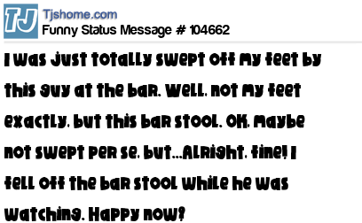 X  I was just totally swept off my feet by this guy at the bar. Well, not my feet exactly, but this bar stool. Ok, maybe not swept per se, but...Alright, fine! I fell off the bar stool while he was watching. Happy now?