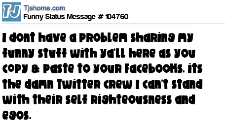 X says I dont have a problem sharing my funny stuff with ya'll here as you c0py & paste to your Facebooks, its the damn Twitter crew I can't stand with their self righteousness and egos.