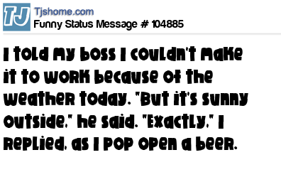 X I told my boss I couldn't make it to work because of the weather today. "But it's sunny outside," he said. "Exactly," I replied, as I pop open a beer.