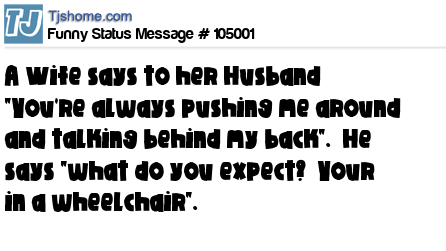 - # 83317 A wife says to her husband you're always pushing me around and talking behind my back. He says what do you expect? You're in a wheel chair.