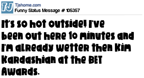 X is It's so hot outside! I've been out here 10 minutes and I'm already wetter then Kim Kardashian at the BET Awards.