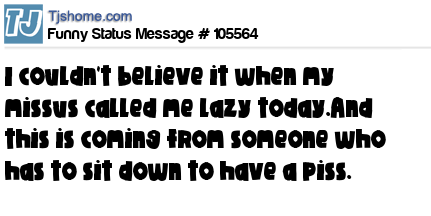 X  I couldn't believe it when my missus called me lazy today.And this is coming from someone who has to sit down to have a piss.
