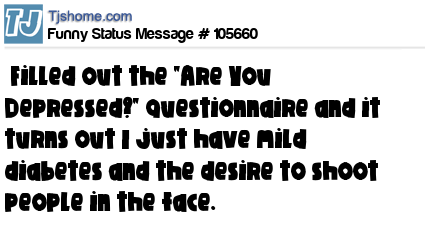 X Filled out the "Are You Depressed?" questionnaire and it turns out I just have mild diabetes and the desire to shoot people in the face.