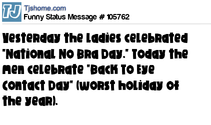 X yesterday the ladies celebrated "National No Bra Day." Today the men celebrate "Back To Eye Contact Day" (worst holiday of the year).