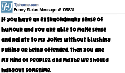 X If you have an extraordinary sense of humour and you are able to make sense and relate to my jokes without blushing, puking or being offended, then you are my kind of peoplez and maybe we should hangout sometime.