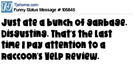 X says Just ate a bunch of garbage. Disgusting. That's the last time I pay attention to a raccoon's Yelp review.