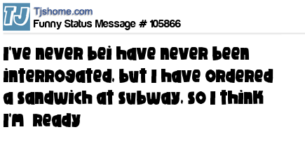 - # 105856 I've never been interrogated, but I have ordered a sandwich at subway, so I think I'm prepared.