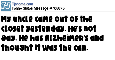 - # 89114 so....my uncle came out of the closet yesterday....Oh, he's not gay....he just has Alzheimer's and thought it was his car....