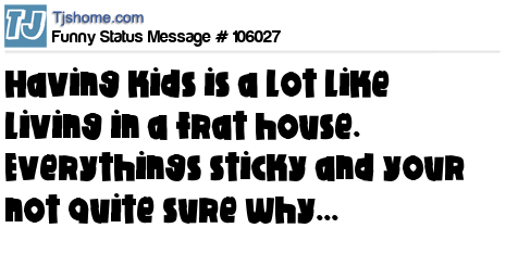 X says Having kids is a lot like living in a frat house. Everythings sticky and your not quite sure why...