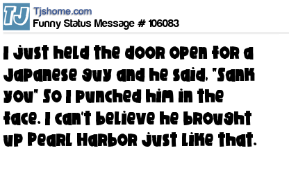 - # 83937 Just held the door open for an old Asian man. He said “sank you!” He better not be referring to Pearl Harbor…!