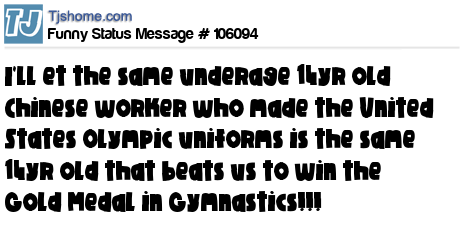 X is I'll et the same underage 14yr old Chinese worker who made the United States Olympic uniforms is the same 14yr old that beats us to win the Gold Medal in Gymnastics!!!