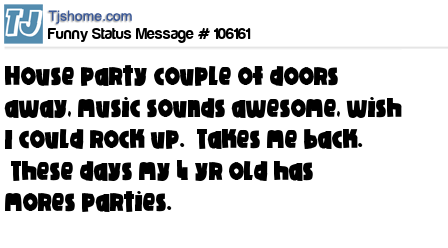 X House party couple of doors away, music sounds awesome, wish I could rock up. Takes me back. These days my 4 yr old has mores parties.
