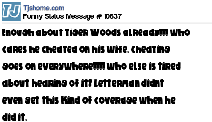 X is enough about Tiger Woods already!!! who cares he cheated on his wife. Cheating goes on everywhere!!!! who else is tired about hearing of it? Letterman didnt even get this kind of coverage when he did it.