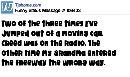 X is Two of the three times I've jumped out of a moving car, Creed was on the radio. The other time my grandma entered the freeway the wrong way.