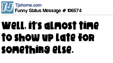 - # 32014 I always feel awkward sitting around waiting for people to show up. That's why I'm always late. I don't care if you're late, just be less late than me.