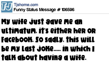 X My wife just gave me an ultimatum, it's either her or Facebook. So sadly, this will be my last joke..... in which I talk about having a wife.
