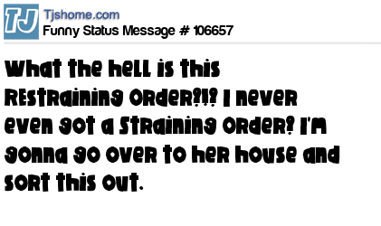 X says What the hell is this REstraining Order?!? I never even got a Straining Order? I'm gonna go over to her house and sort this out.