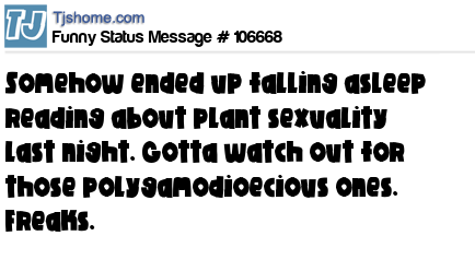 X is Somehow ended up falling asleep reading about plant sexuality last night. Gotta watch out for those polygamodioecious ones. Freaks.