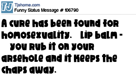 X  A cure has been found for homosexuality.    Lip balm -     you rub it on your arsehole and it keeps the chaps away.