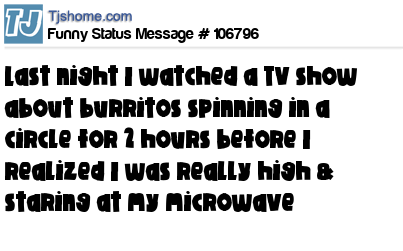 X Last night I watched a TV show about burritos spinning in a circle for 2 hours before I realized I was really high & staring at my microwave