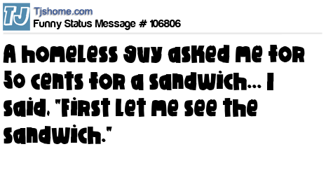 - # 70339 A homeless guy asked me for 50 cents for a sandwich. I said, "First lemme see the sandwich."