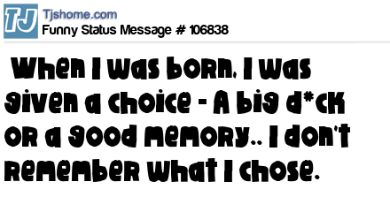 - # 38830 When I was born, I was given a choice - A big di*k or a good memory.. the thing is I can't remember which I chose.