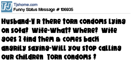 X Husband-Y r there torn condoms lying on sofa? Wife-What? Where? Wife goes 2 find them & comes back angrily saying-Will you stop calling our children “Torn condoms”?