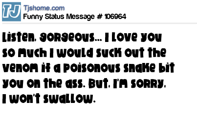 X says Listen, gorgeous... I love you so much I would suck out the venom if a poisonous snake bit you on the ass. But, I'm sorry, I won't swallow.