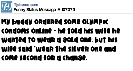 - # 87082 Husband:"My Olympic condoms are here, I think I'll wear the gold one 2night" Wife:"Couldnt you wear the silver one and come 2ND 4 a change"