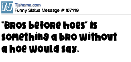 - # 204616 Personally, I don't believe in Bros Before Hoes or Hoes Before Bros. There needs to be a balance. Sort of a homie-hoe-stasis.
