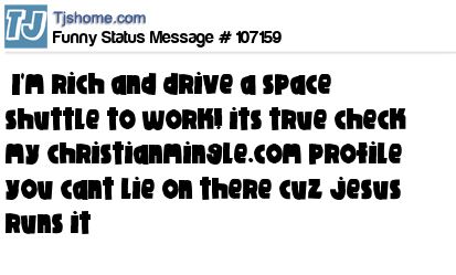 X   I'm rich and drive a space shuttle to work! its true check my christianmingle.com profile you cant lie on there cuz jesus runs it
