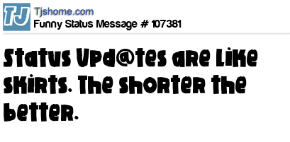 - # 29302 You know I like my status updates like I like my mini skirts. Long enough to cover the important parts but short enough to keep things interesting."