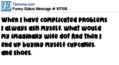 X says When I have complicated problems I always ask myself, what would my imaginary wife do? And then I end up buying myself cupcakes, and shoes.