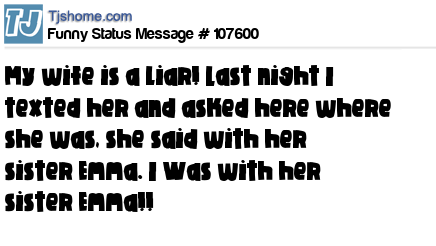 X  My wife is a liar! Last night I texted her and asked here where she was, she said with her sister Emma. I Was with her sister Emma!!