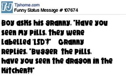 - # 6413 Boy asks his granny, "Have you seen my pills, they were labeled 'LSD'?" Granny replies, "F*ck the pills, have you seen the dragon in the kitchen?!"