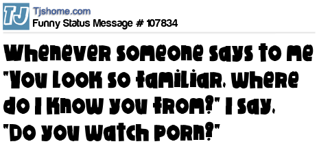 - # 79218 Whenever someone asks, "You look familiar, where do I know you from?" I like to respond with, "Well do you watch porn?"