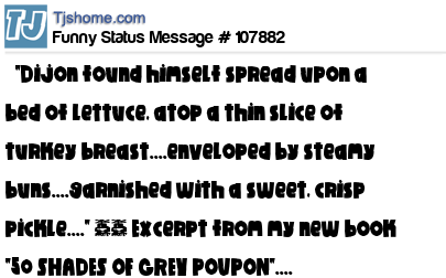 X says "Dijon found himself spread upon a bed of lettuce, atop a thin slice of turkey breast....enveloped by steamy buns....garnished with a sweet, crisp pickle...." ~~ Excerpt from my new book "50 SHADES OF GREY POUPON"....