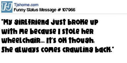 - # 98423 My girlfriend left me after I broke her wheelchair..... Oh,, I think she'll come crawling back soon..