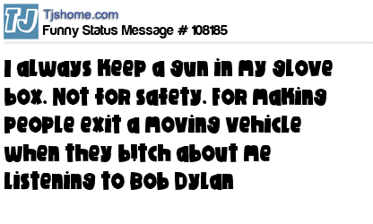 X says I always keep a gun in my glove box. Not for safety. For making people exit a moving vehicle when they b!tch about me listening to Bob Dylan