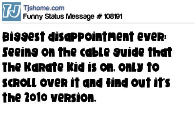X Biggest disappointment ever: Seeing on the cable guide that The Karate Kid is on, only to scroll over it and find out it's the 2010 version.