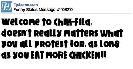 X Welcome to Chik-Fila, doesn't really matters what you all protest for, as long as you EAT MORE CHICKEN!!