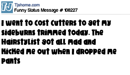 X is I went to Cost Cutters to get my sideburns trimmed today. The Hairstylist got all mad and kicked me out when I dropped me pants